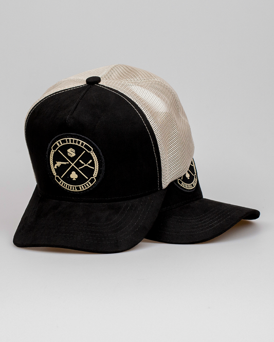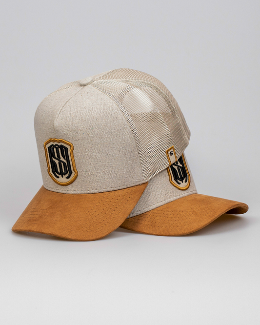 Boné Mr. Shelby Trucker Brasão Camurça Preto e Bege