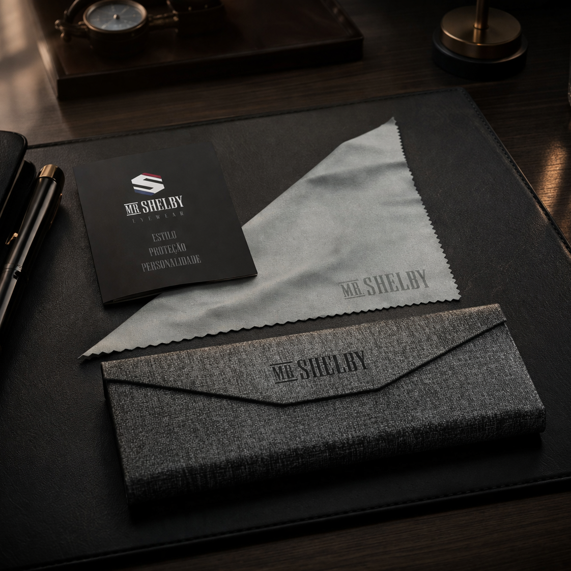 Sim. Os óculos Mr. Shelby acompanham itens que reforçam a experiência da marca, como case de proteção e flanela de limpeza.